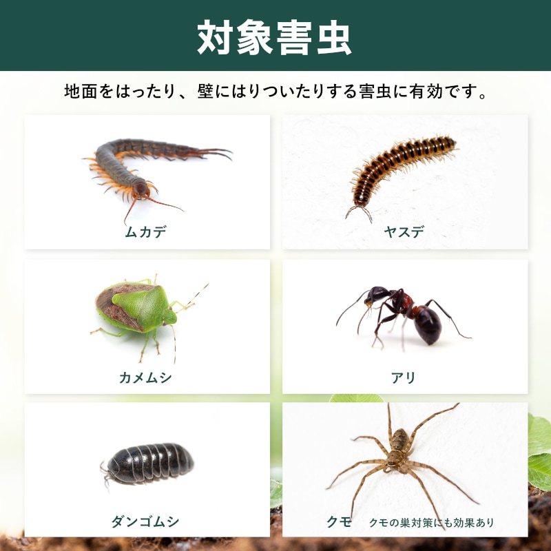 ムカデ、ヤスデ、ワラジムシ、ダンゴムシ、ゲジ、カマドウマ、コオロギ、ハサミムシ、クモ、アリ類など